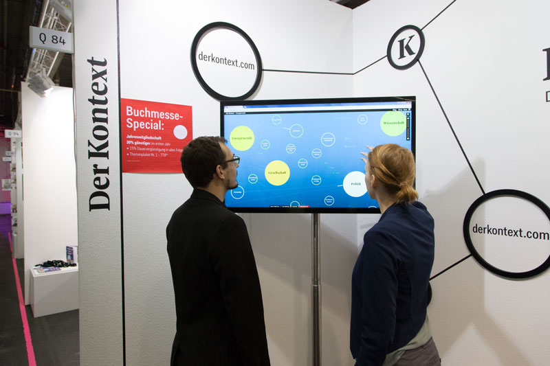 Plottbuchstaben, Isolierband, Wandfarbe, Pinsel und ein paar Kontext-Kringel aus Holz. Recht viel mehr haben wir für unseren Messestand gar nicht benötigt. Bis auf ein paar technische Geräte natürlich, auf denen “Der Kontext” von unseren Besuchern ausprobiert werden konnte. Besonders glücklich waren wir da über unseren 46’’ Touchmonitor.